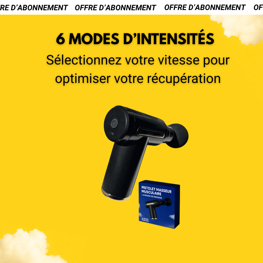Pour ceux qui souhaitent optimiser leur récupération après chaque séance de sport, notre pistolet masseur musculaire est l'outil idéal. Conçu pour apaiser les tensions et favoriser une meilleure circulation sanguine, il permet de récupérer plus rapidement, sans douleurs musculaires. Grâce à cet appareil, vous pourrez enchaîner vos entraînements à 300% d'énergie, prêt à vous surpasser à chaque séance, sans limite !