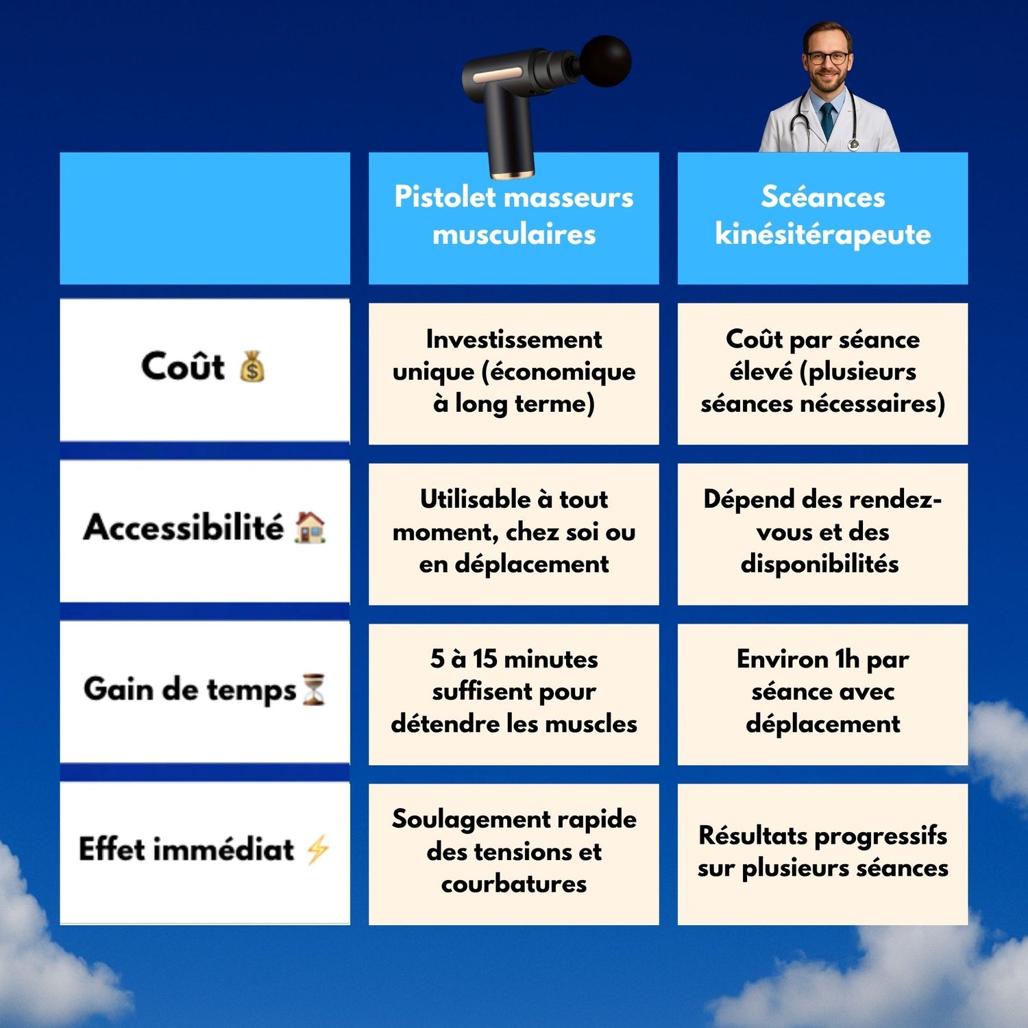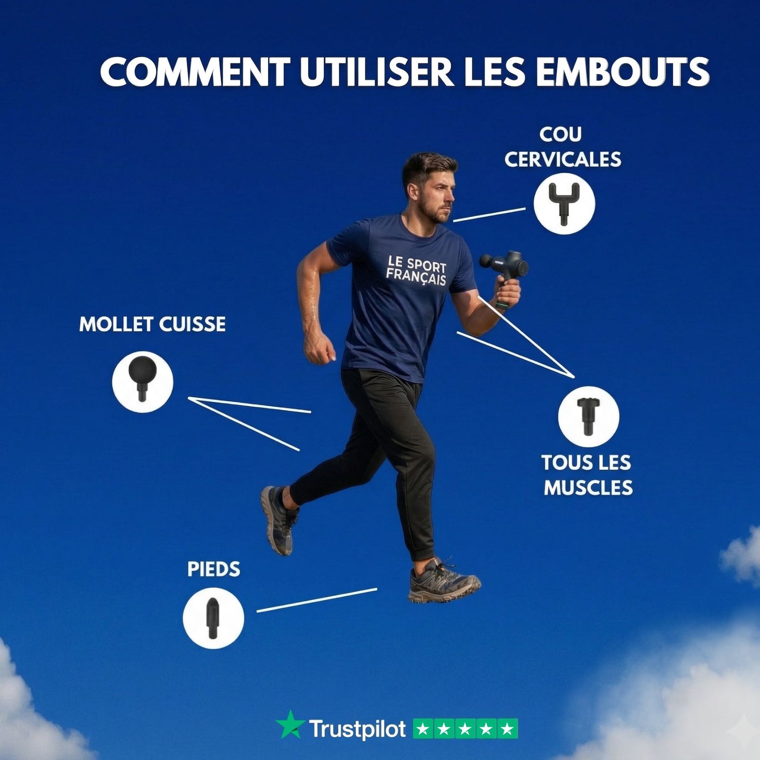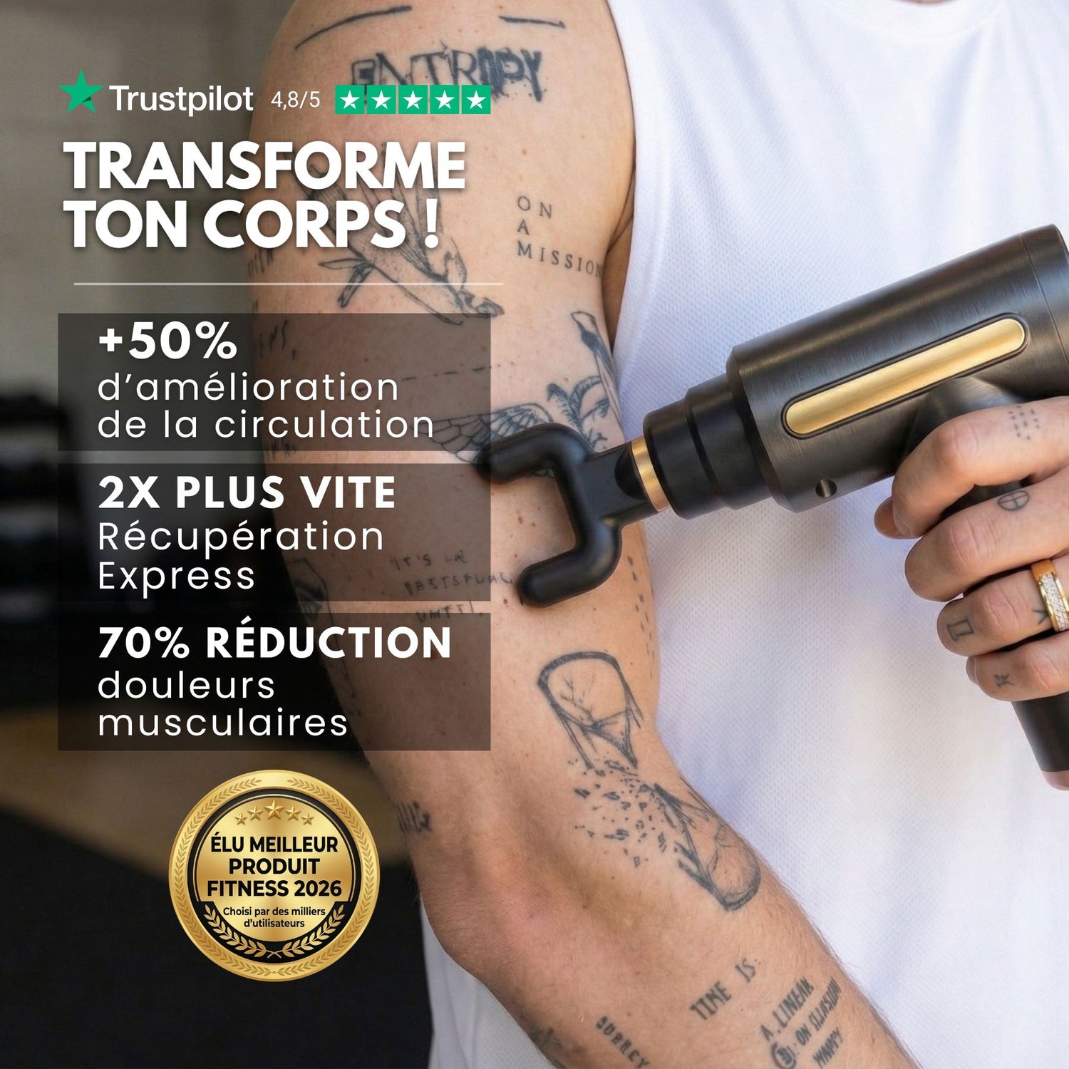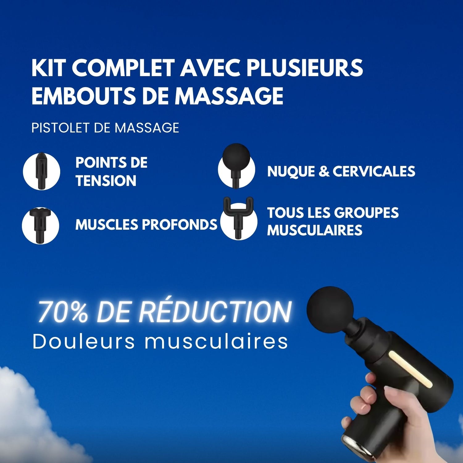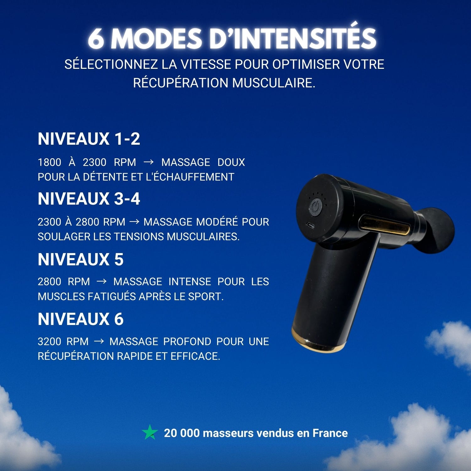 Pour ceux qui souhaitent optimiser leur récupération après chaque séance de sport, notre pistolet masseur musculaire est l'outil idéal. Conçu pour apaiser les tensions et favoriser une meilleure circulation sanguine, il permet de récupérer plus rapidement, sans douleurs musculaires. Grâce à cet appareil, vous pourrez enchaîner vos entraînements à 300% d'énergie, prêt à vous surpasser à chaque séance, sans limite !